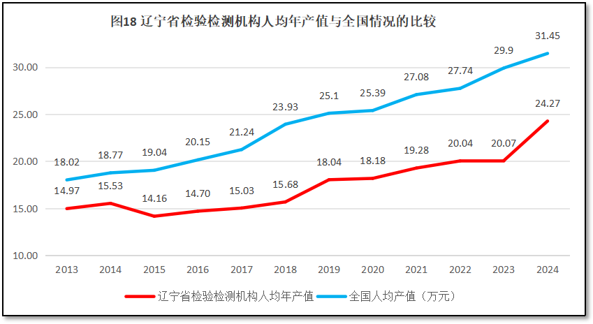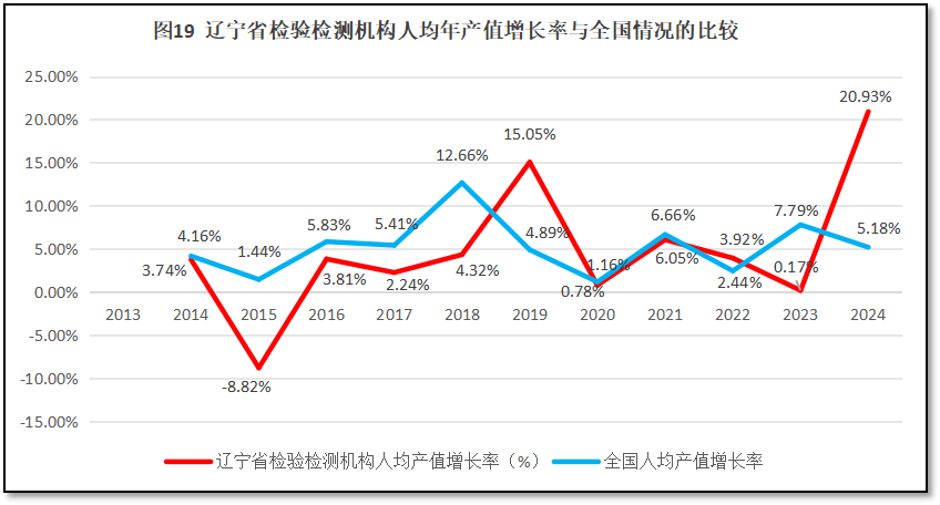 由图18可见,辽宁省检验检测机构人均年产值增长曲线在2023年之前都比较平坦,没有出现太大的增长峰值,增长动能不足,且与全国的增长率曲线的距离越拉越大,但2024年度出现了一个较为显著的增长,与全国的差距有所缩小。