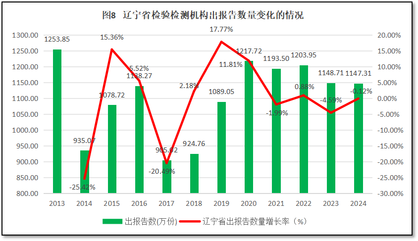从图8来看,12年来,辽宁省检验检测机构对外出具的检验检测报告数量各年起伏不定,并没有呈现逐步增加或者减少的情况,而是主要在900万到1.2千万之间波动,最近几年检验检测报告数量有逐步减少的趋势。2024年辽宁省检验检测机构出具的报告数量1147.31万份,还没有2013年出报告数量1253.85万份高。从增长率曲线来看,辽宁省检验检测机构出具报告数量增长率呈现一个M型的变化趋势,在2014年和2017年出现两个大幅降低,在2015年和2019年又出现两个高增长,但最终的增加幅度互相抵消,年均增速仅为0.08%,变化很微小。